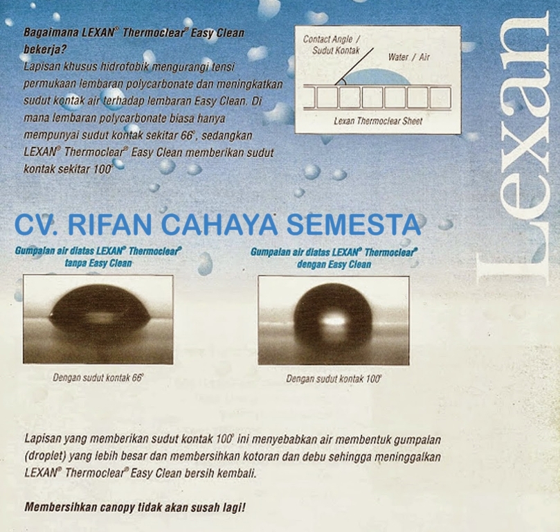 Lapisan khusus hidrofobik mengurangi tensi permukaan lembaran Polycarbonate dan meningkatkan sudut kontak air terhadap lembaran easy clean. Dimana lembaran Polycarbonate biasa hanya mempunyai sudut kontak sekitar 66 derajat, sedangkan Lexan Thermoclear Easy Clean memberikan sudut kontak sekitar 100 derajat. Lapisan yang memberikan sudut kontak 100 derajat ini menyebabkan air membentuk gumpalan (Draplet) yang lebih besar dan membersihkan kotoran dan debu sehingga meninggalkan Lexan Thermoclear Easy Clean bersih kembali.