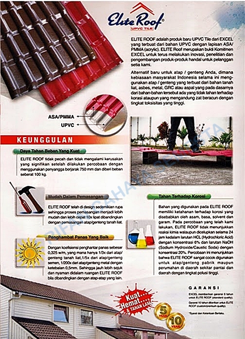 Atap Elite Roof adalah produk baru UPVC Tile dari Excel yang terbuat dari bahan UPVC dengan lapisan ASA/PMMA (Acrylic). Atap Elite Roof merupakan bukti Komitmen Excel untuk terus melakukan inovasi, penelitian dan pengembangan produk-produk handal untuk pelanggan setia kami.